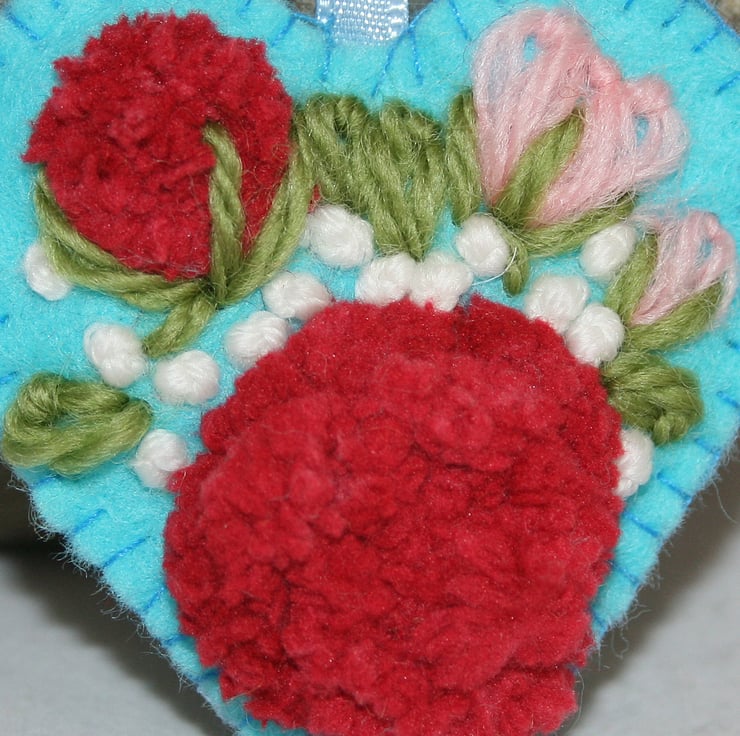 The background of this heart-shaped brooch has been cut from a turquoise felt. The flowers have been embroidered, in simple stitches, using a 'knitted' ribbon yarn, soft white merino yarn and tapestry wool.