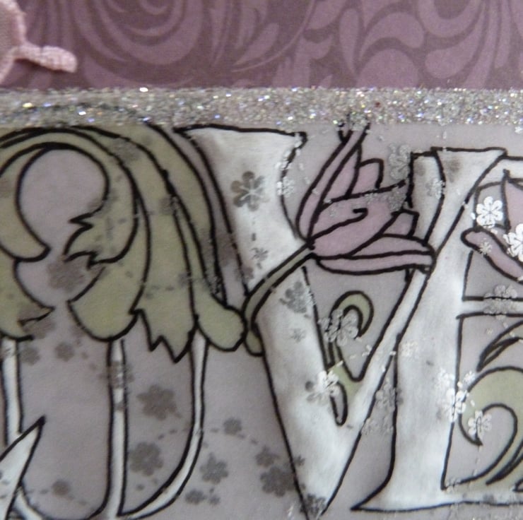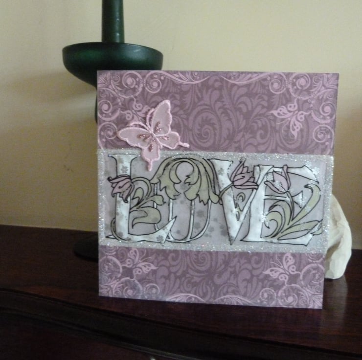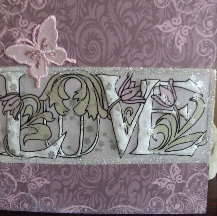 The word 'LOVE' embossed onto flowery lustre parchment paper. Decorated with art deco flowers and coloured. Mounted onto mauve decorative paper. Embellished with fine fairy glitter and pink fabric butterfly.