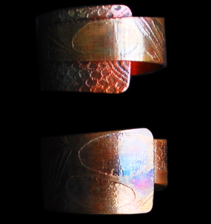 These etched copper rings are formed like an overlapping coil so that they can be adjusted to fit. Very comfortable to wear. The copper is etched using non toxic processes, hand cut and formed using traditional jewellery tools. These etched copper rings can be pinched or stretched to any size. They can be either natural copper or heat coloured: please let me know when paying which you would prefer. (second image shows colourised effect) Also let me know if you would prefer a deep or narrow band ( I recommend people with small, delicate fingers should request a narrower band - if you know your ring size, this will help me determine which depth is best suited to your finger)