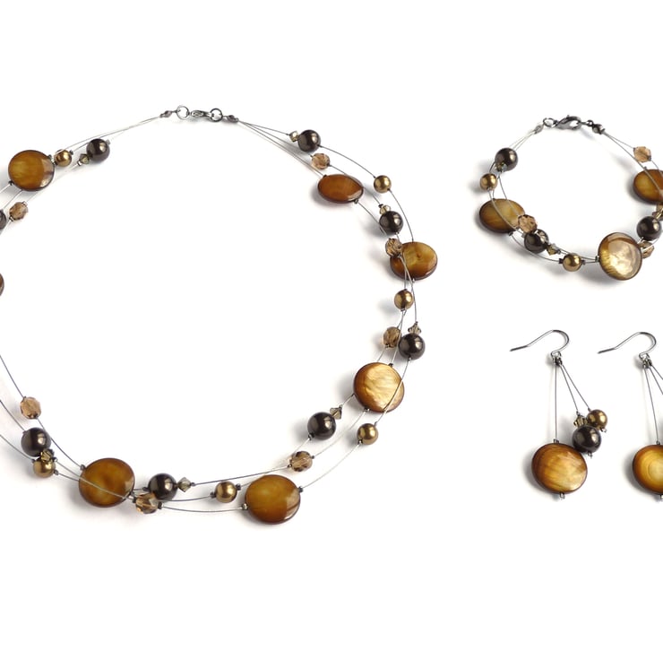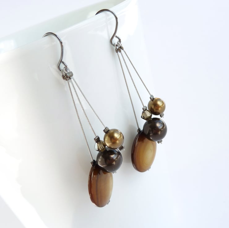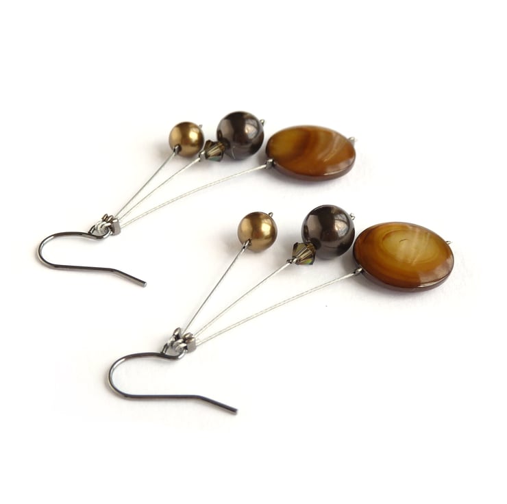 These golden brown earrings feature mother of pearl beads, shimmering crystals, glass pearls and Czech glass. These three strand earrings can be worn everyday and are perfect for those who suit autumnal colours.