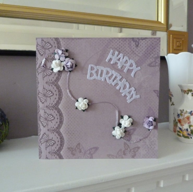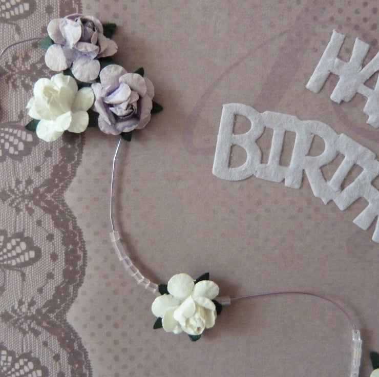 A twirl of mauve wire threaded with clear beads. Mounted onto mauve decorative paper and embellished with white and lilac roses and a lilac Happy Birthday motif.