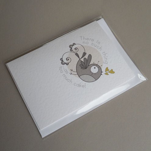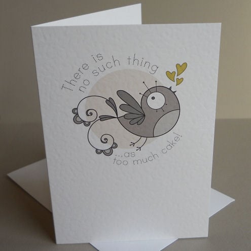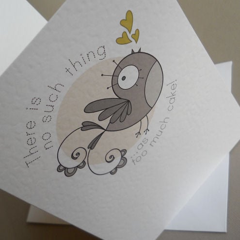 ...so says the cakebird, and i'm inclined to agree! unique and quirky illustrated card, featuring a chocolate brown bird, singing his heart out. pistachio coloured hearts, of course. and all on a cappuchino coloured background!
