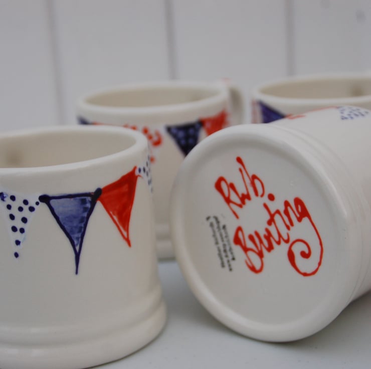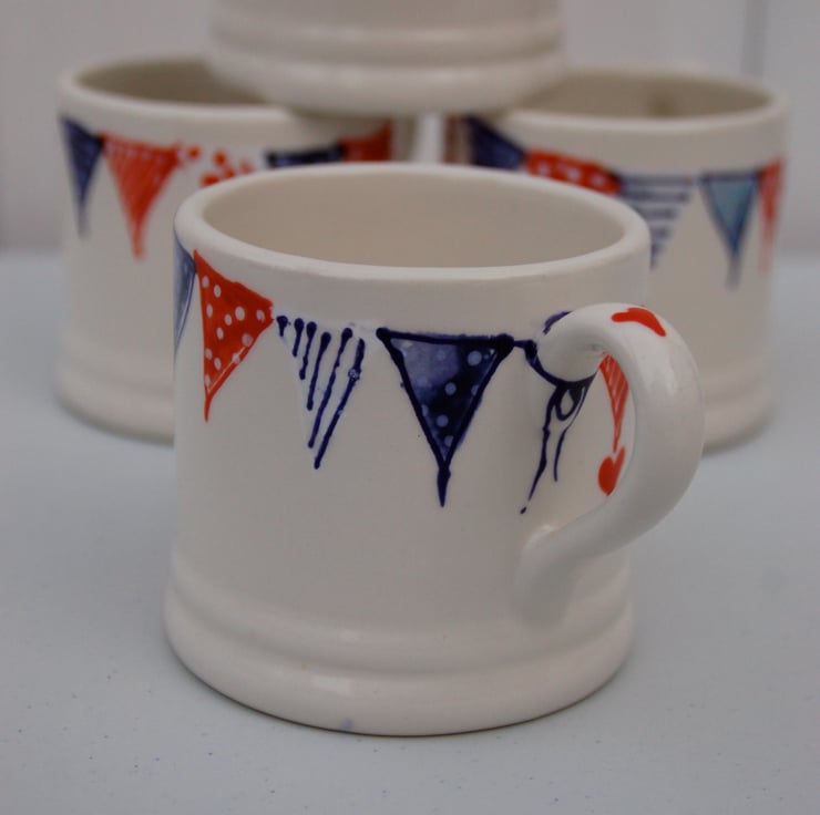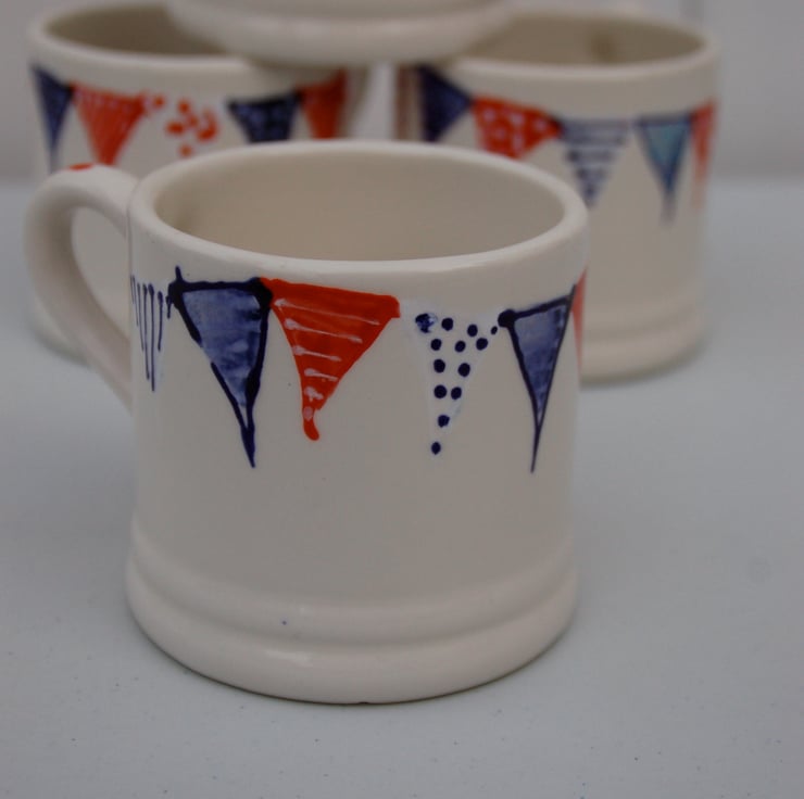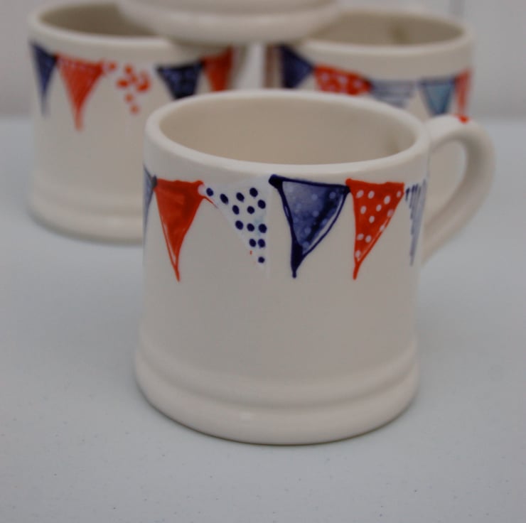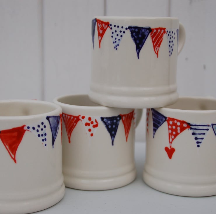 This is a handpainted individually produced bunting motif on an earthenware mug. The flags are red white and blue, with stripes and hearts, additional hearts on the bottom of some flags. the bunting is tied on the the handle. I have listed 4 of these mugs they are all hand painted so will differ slightly. i do this design on other pots, please have a look!