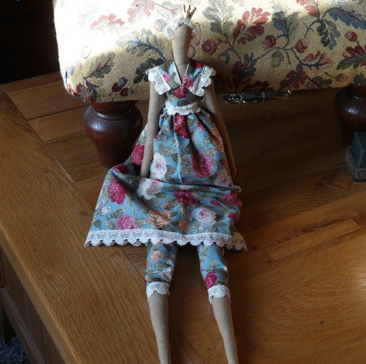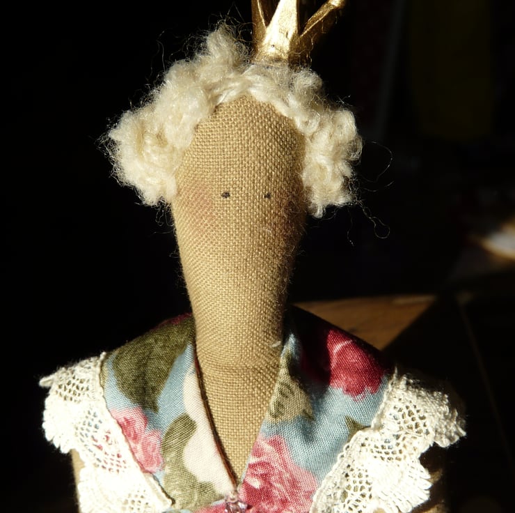 Hand sewn 19" tall doll in a vintage rose print fabric dress finished with antique ribbon and wearing a golden crown!
