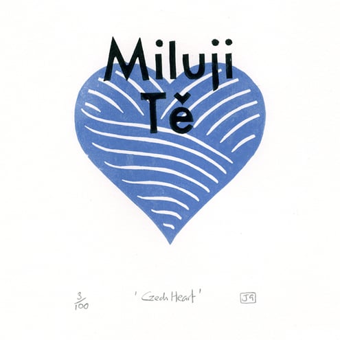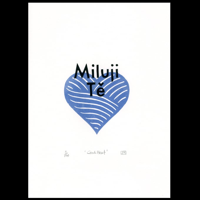 A 2-colour hand-printed linocut print entitled 'Czech Heart'.