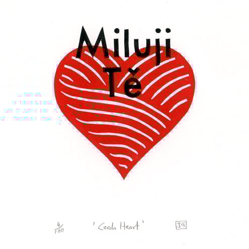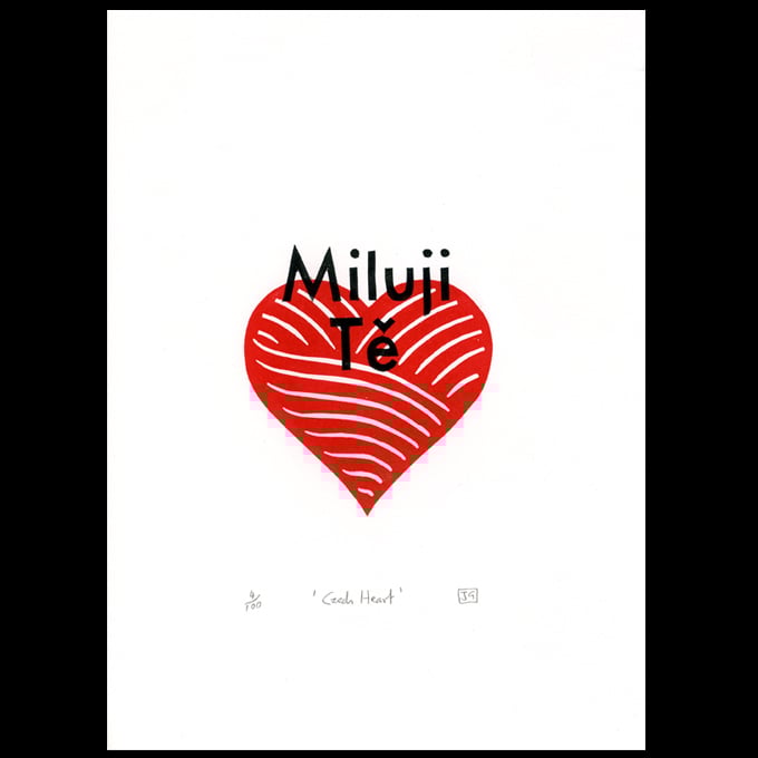 A 2-colour hand-printed linocut print entitled 'Czech Heart'.