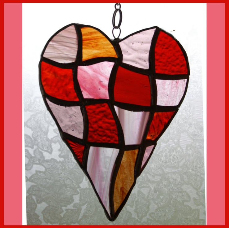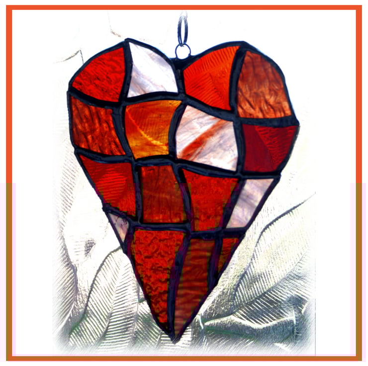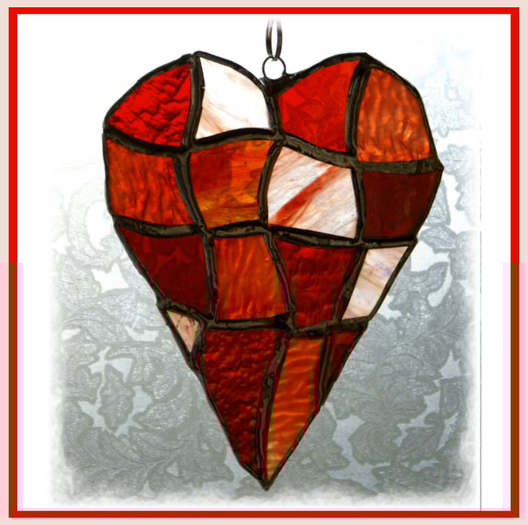 It is a simple heart shape but a patchwork arrangement of 16 pieces, half of pure red glass and the other 8 in white streaked blood red glass. I am really delighted with this mixture of shades.