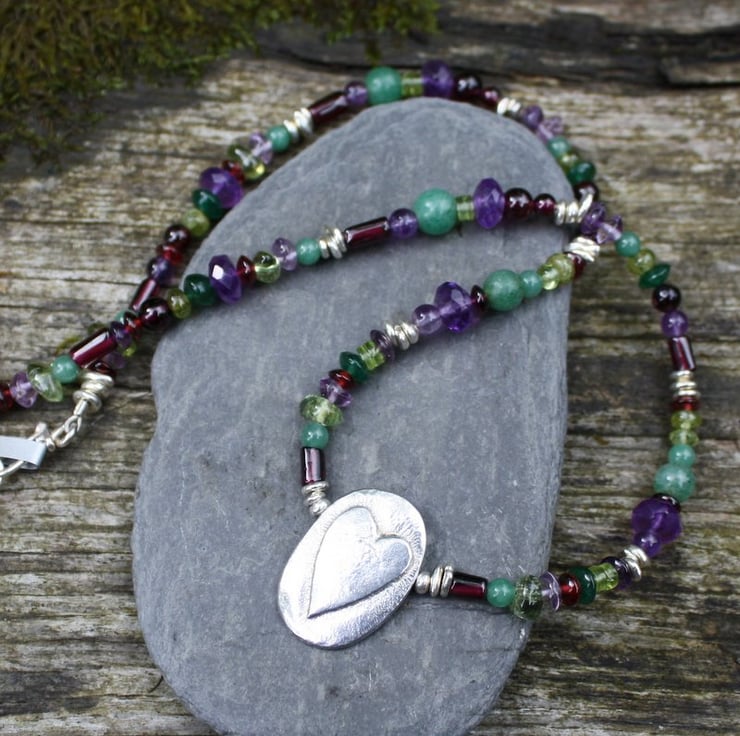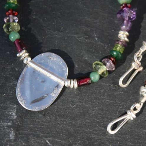 The silver pendant focal is strung with a rich warm colourful mix of semi-precious gemstone beads, and closes with a handmade clasp.