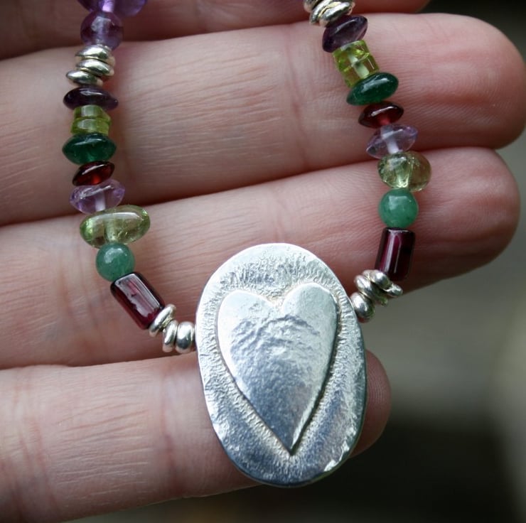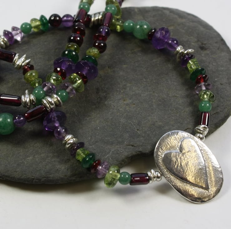 Garnets ,amethysts, aventurine and peridot in many shapes and sizes are periodically intersperced with fine silver beads.