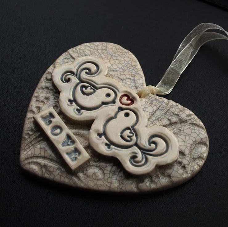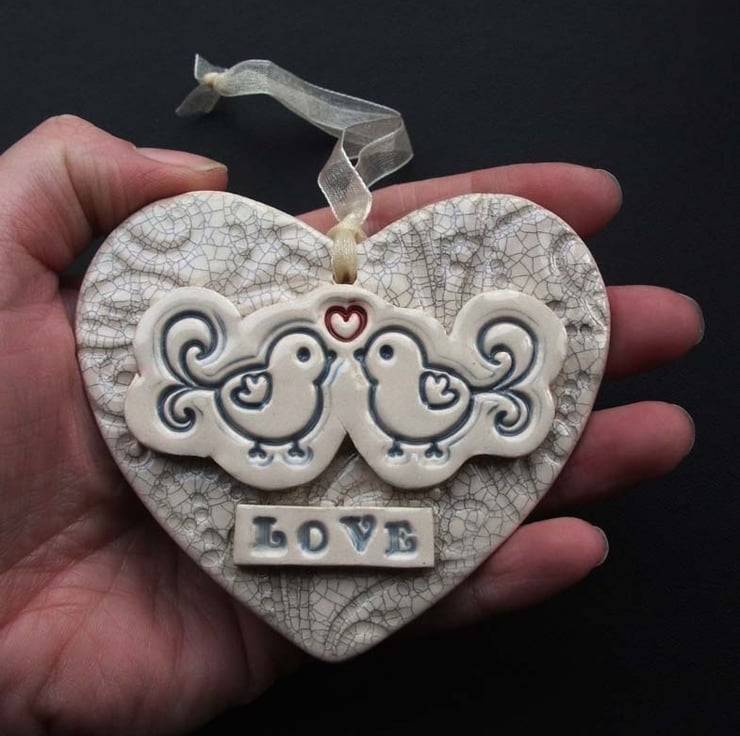 This ceramic heart is made from white earthenware clay and decorated with a sweet little pair of lovebirds.