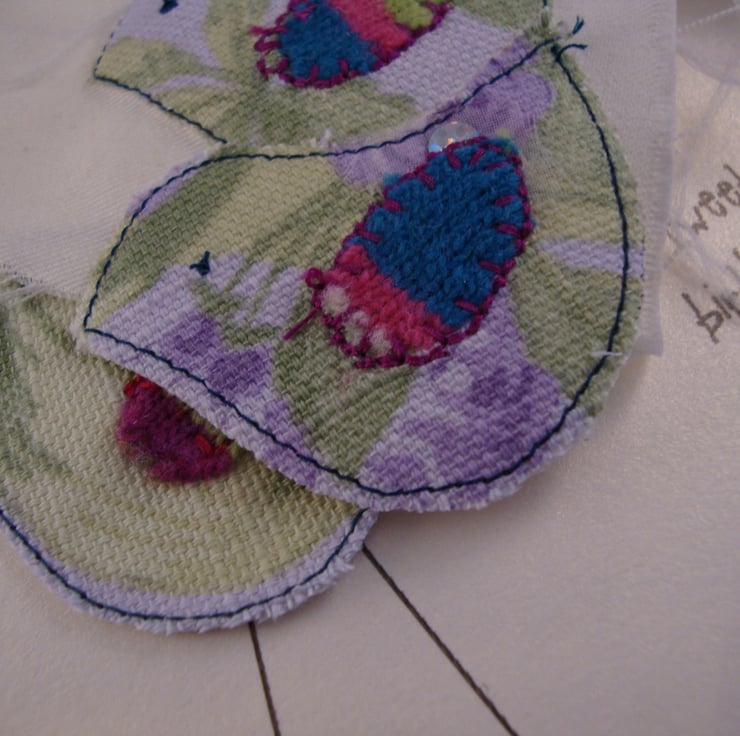 it is made from a pretty laura ashley floral fabric and wool with machine embroidery on a cream card.
