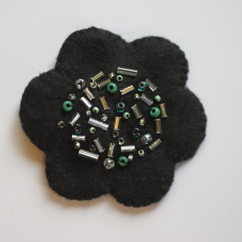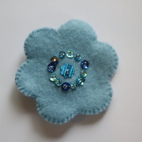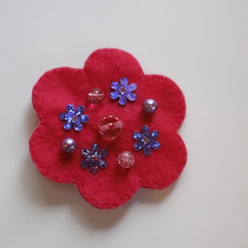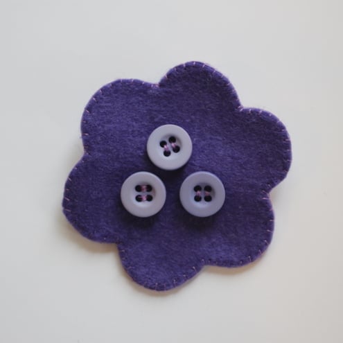 These fun felt flower brooches are hand stitched and decorated with a variety of sequins, buttons and beads as depicted - purple sequin, pink sequin and bead, purple button, blue sequin, black bead. Please specify with one(s) you would like when purchasing. The brooch fastenings are silver plated and the brooches measure approx 68 mm across. These make a lovely original gift or simply an individual treat for yourself!