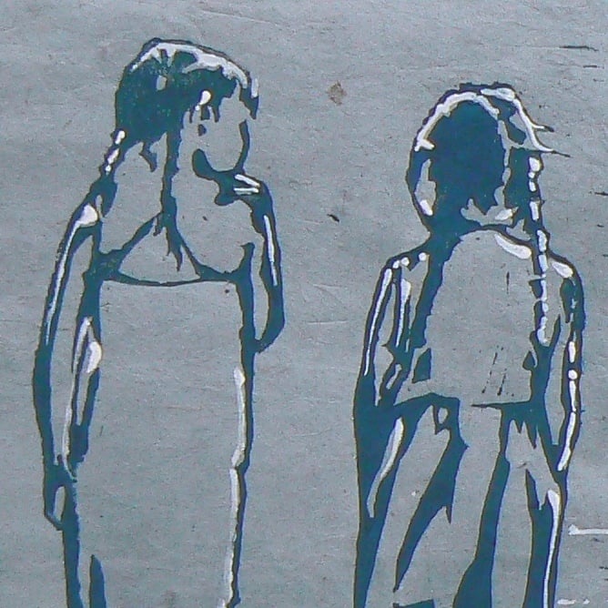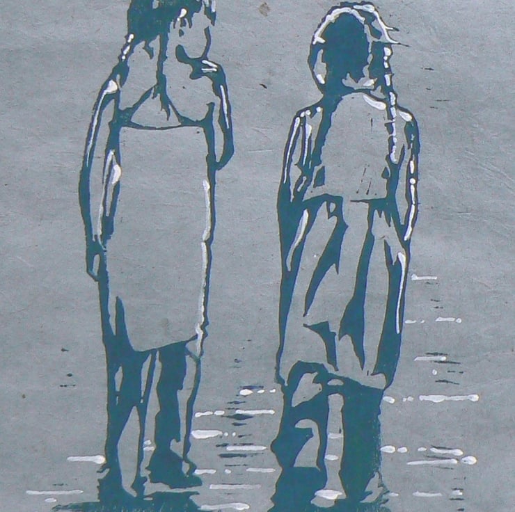 This linocut is hand printed in deep blue ink onto handmade paper, made from lokta and dyed blue grey. The picture is then hand finished with white ink to give a little sparkle.