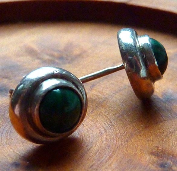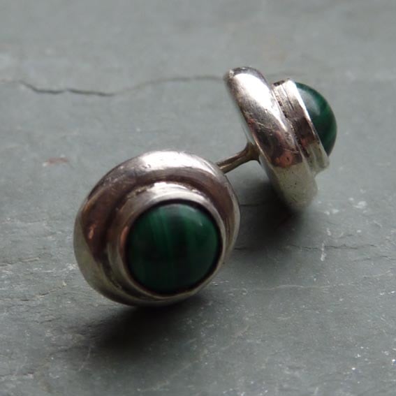 Pleasingly heavy solid silver earrings set with a 5mm gorgeous green Malachite. These irregular round studs have an organic quality and will add glamour to any outfit. They compliment the atomic heart necklace nicely!