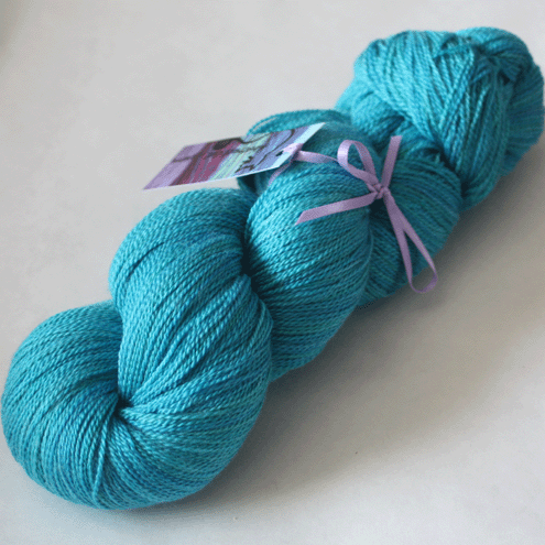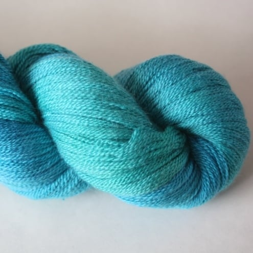 Dyed in shades of turquoise to almost jade (there is slightly more colour variation than the photos show), this soft, silky yarn should produce beautiful, drapey lace projects. This skein has been reskeined as shown in the first two photographs. The third photograph shows it in its original form, for reference only.