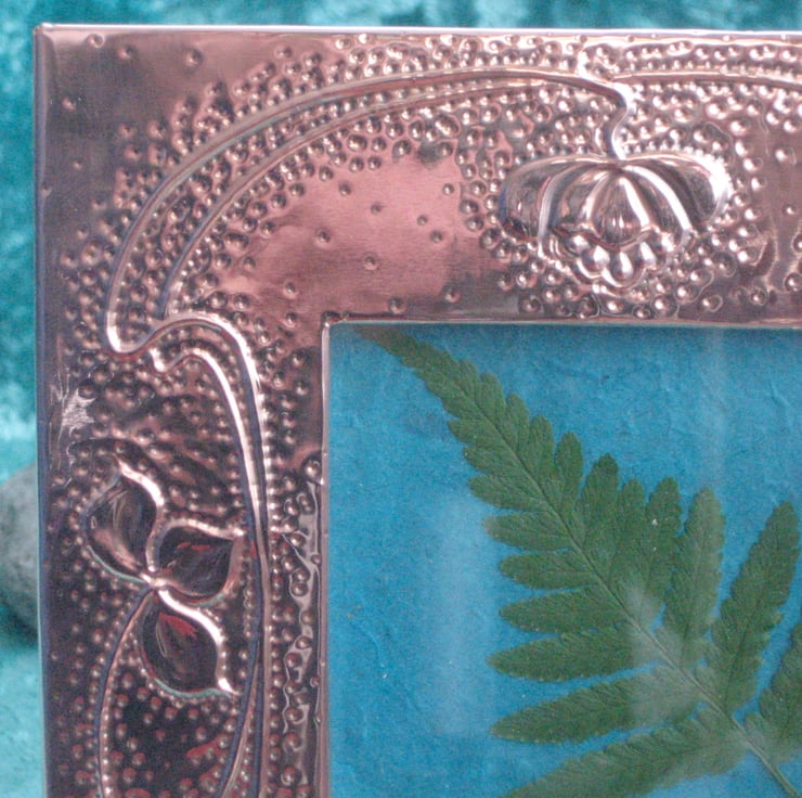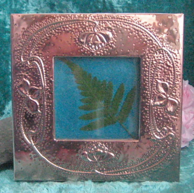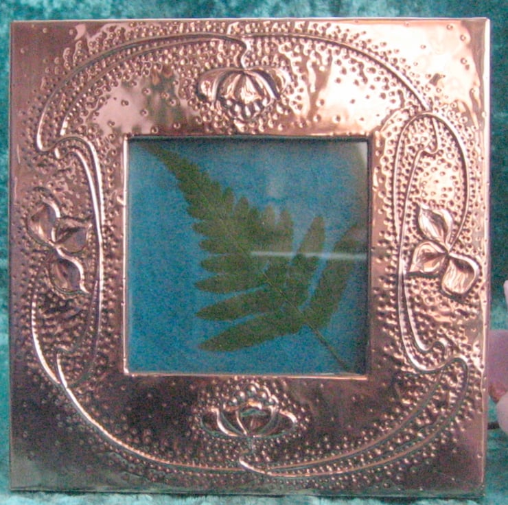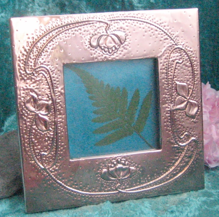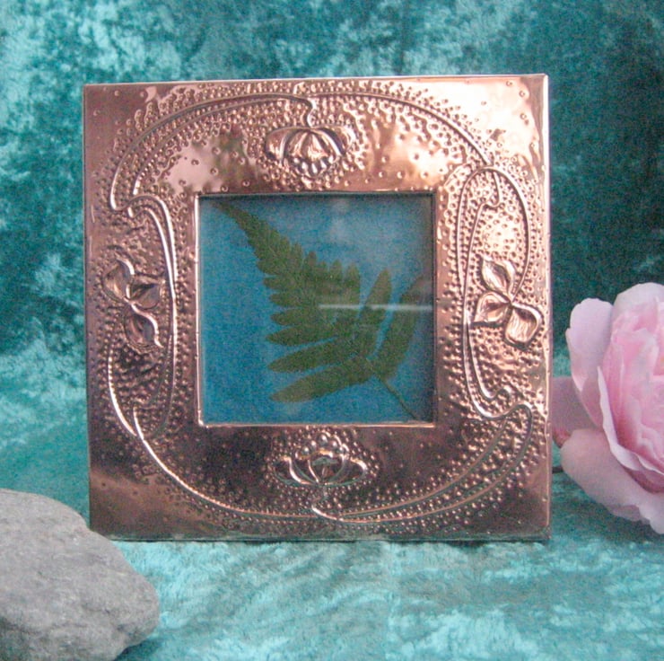 This striking frame has been handmade in copper using the repousse method popular with the Arts and Crafts movement. It measures 137 x137mm (5.5" x 5.5" approx) and takes a photograph 75 x 75mm (3"x 3" approx). The reverse has a stand and a ring for hanging.