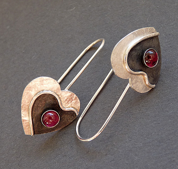 These contemporary heart earrings with Garnet are completely hand made in sterling silver. They have been textured, partially oxidized and polished to a bright and shiny finish. They have sterling silver ear wires soldered to them.