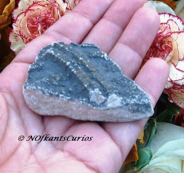 The fossil is still within the natural rock, which is flatter on the back &more domed on the front surface, where you can see the lengths of Crinoid fossil stems displayed.