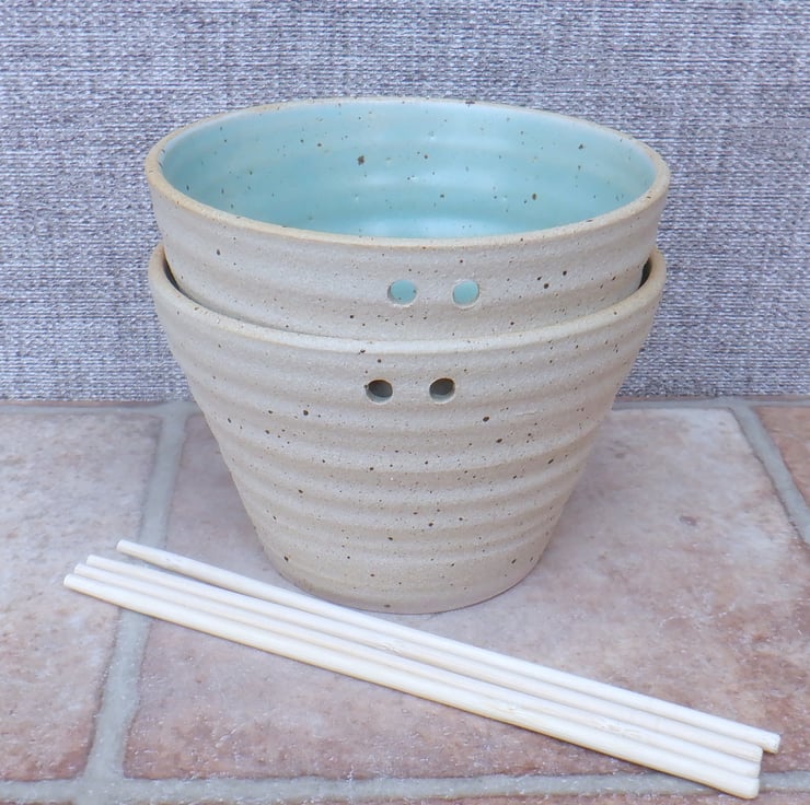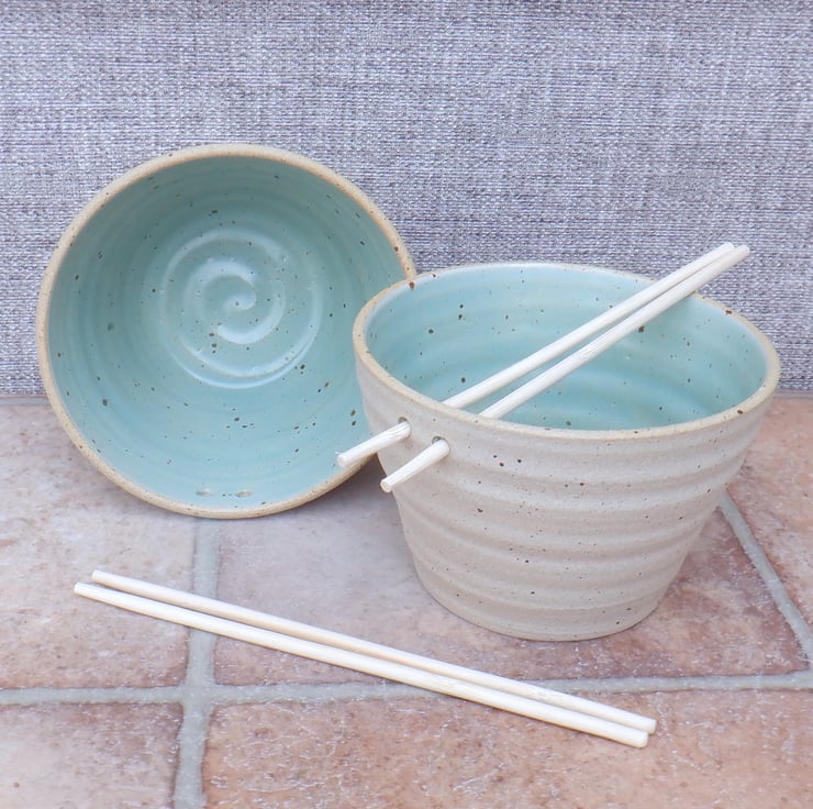 These noodle bowls were thrown on my pottery wheel using strong off-white stoneware clay, with a distinct speckle, and finished in a lovely satin light green celadon glaze.