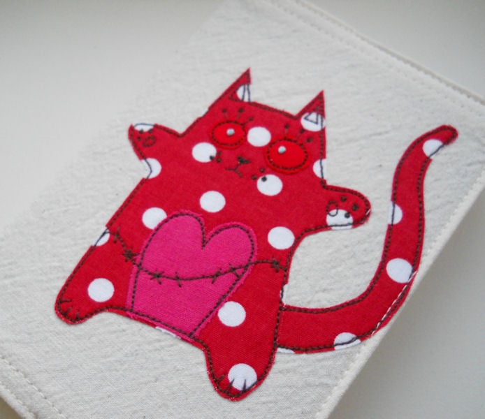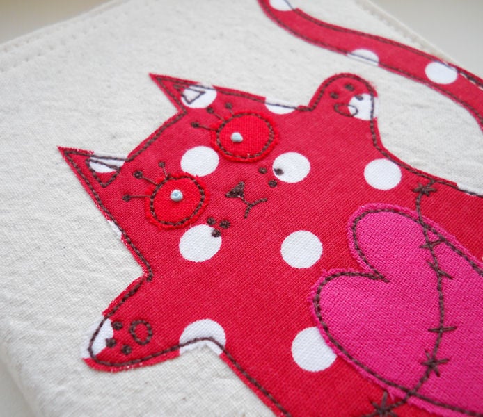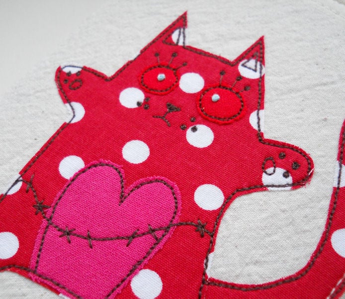 the kitty is in bright red polka dot fabric with a pink heart and red eyes. the cotton fabrics are layered and appliqued onto pre-washed calico, before I draw detail onto them with free machine embroidery. their eyeballs are hand embroidered.