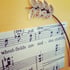 Handmade greetings card featuring a pair of Scandinavian style birds in blue astride a bird feeder made from vintage sheet music. It includes a portion of musical score with the text "play". This cheeky chaps are made from strips of recycled paper using a quilling technique and are mounted on textured pale blue card.
