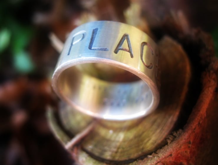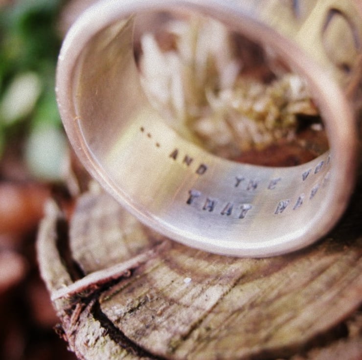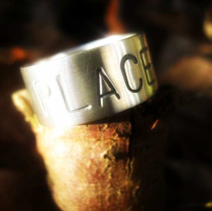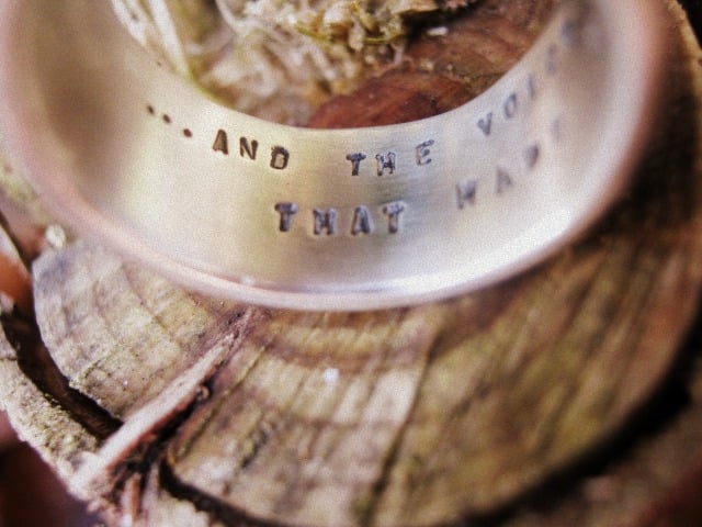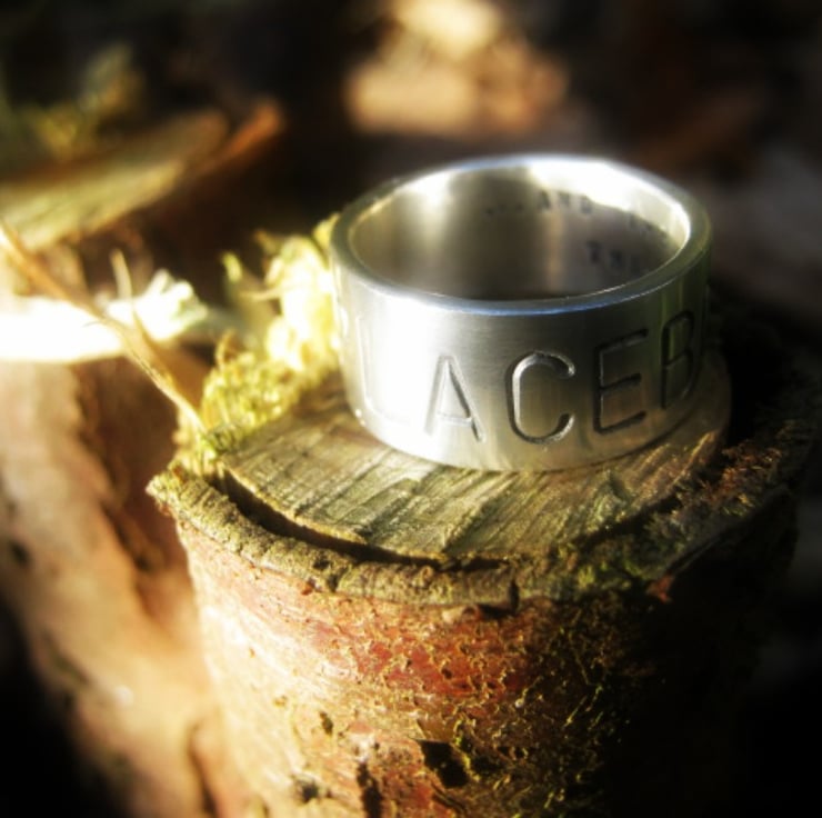 This is a really nice chunky solid silver ring, suitable for a man or woman. The width of the band is 9mm, and the thickness of the silver is 1.5mm. The front can hold one word in huge 6mm letters. If you would like the inside stamping with a secret message I can do that for you too at no extra cost, either 1 or 2 lines of text, with up to 25 characters on each line.