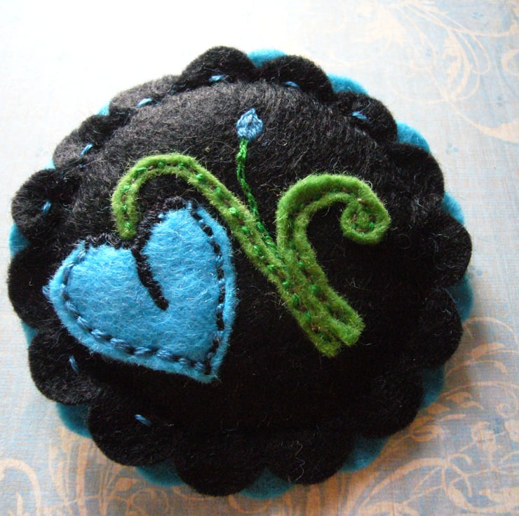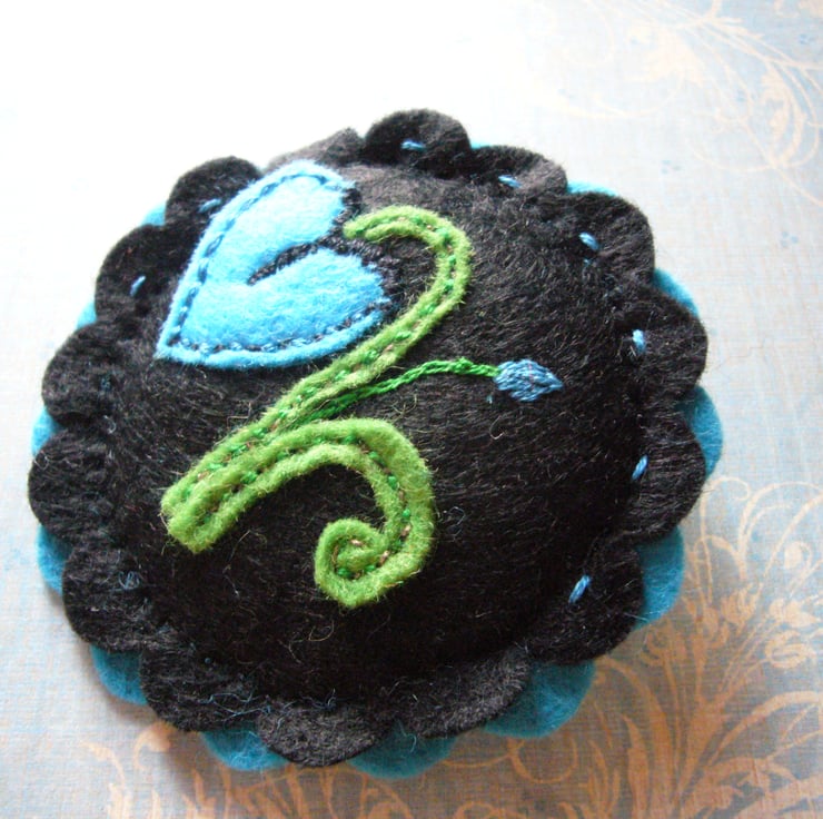 Handstitched Felt Brooch with stylised Turquoise flowers on Black Felt