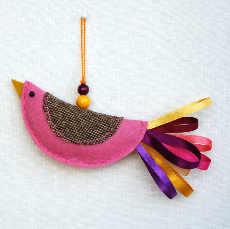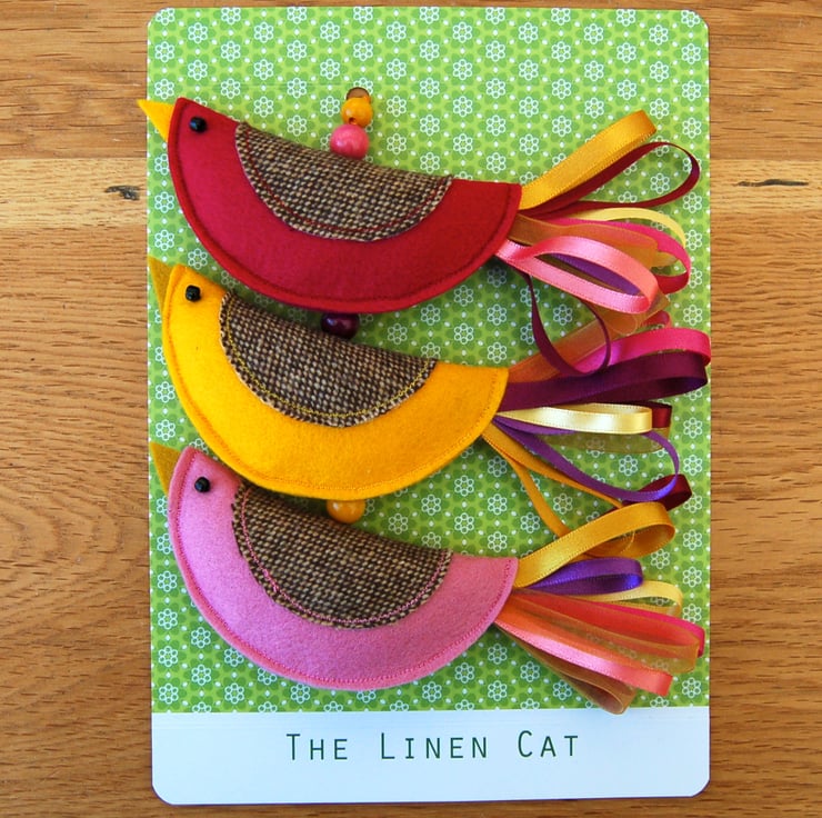 Three bird decorations in magenta, yellow and pink made from wool felt and tweed, with mixed ribbon tails and glass bead eyes.