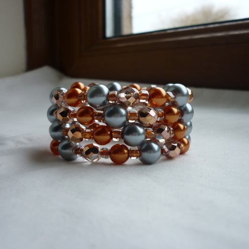 THE BEADS AND COMPONENTS USED IN THE BRACELET ARE 8MM COPPER GLASS PEARLS, 10MM MID GREY GLASS PEARLS, 8MM FIREPOLISHED GLASS BEADS IN COPPER WITH GREY SHADES ALONG WITH MIYUKI GLASS TRIANGLE SHAPES BEADS IN CLEAR WITH BURNT ORANGE INLAY. THE BRACELET HAS BEEN MADE USEING SILVER PLATED MEMORY WIRE WHICH WRAPS AROUND THE WRIST SO NO CLOSURE CLASP IS NEEDED, THE BRACELET IS COMFORTABLE AND EASY TO WEAR.