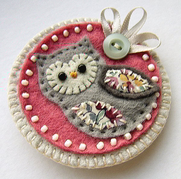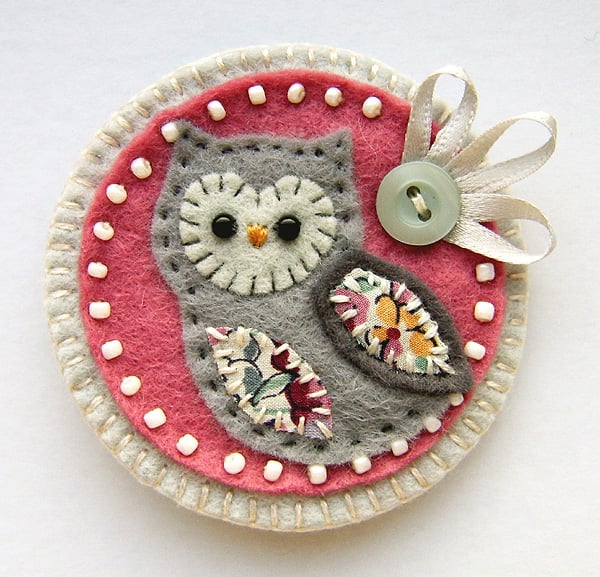 One pink owl on light grey base with cream beading, light grey ribbon and coordinating button.