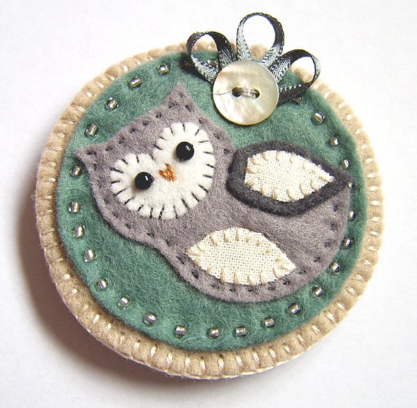 One green owl with off white plain wing with silver beading, shell button and grey ribbon.