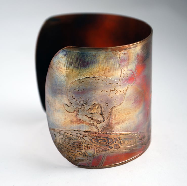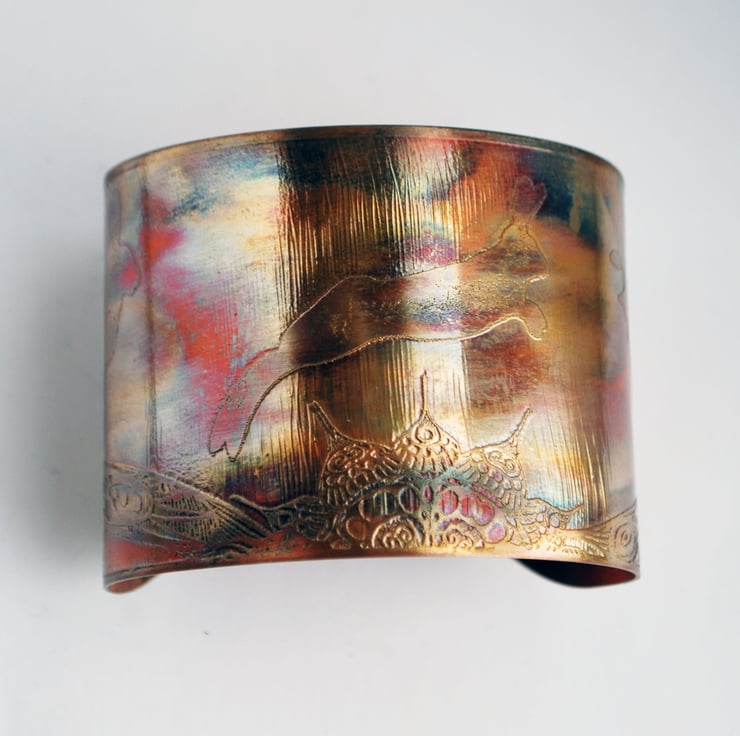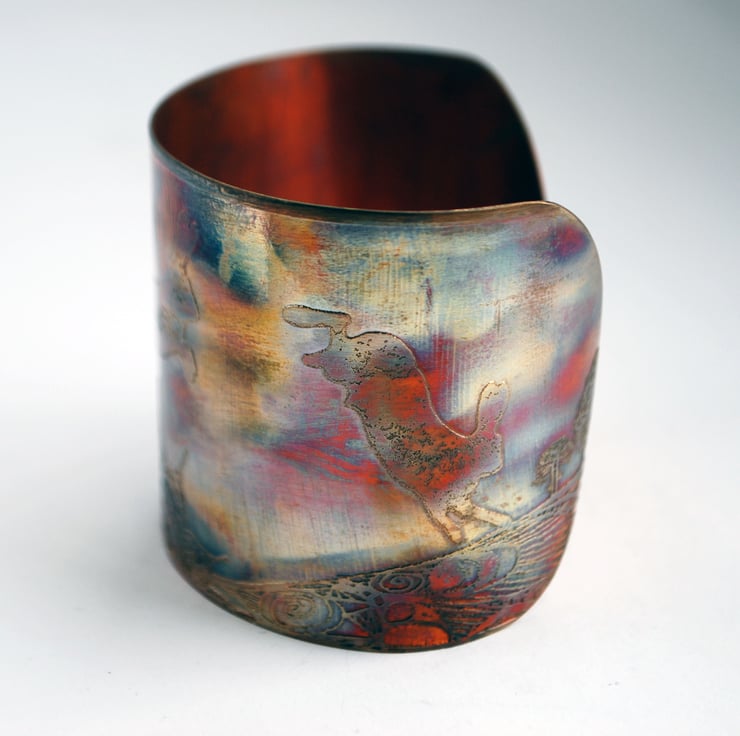 This etched copper cuff bracelet / bangle bearing leaping hares has been heat treated to create a vibrant multicoloured patina: this will deepen over time. I have developed a technique of literally 'painting' with a flame to manipulate the shape and direction of the colours. Although there is a degree of control, each piece is unique, as the colour patina cannot be replicated exactly.