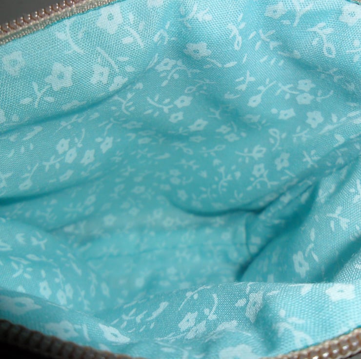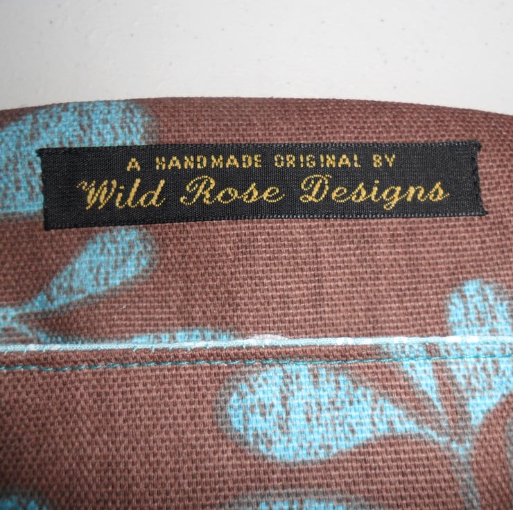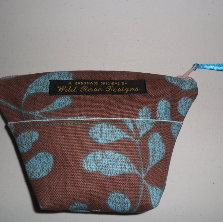 Made in a brown and teal cotton print and with a duck egg blue cotton print lining.There is a small pocket on the front which closes with a small velcro circle.
