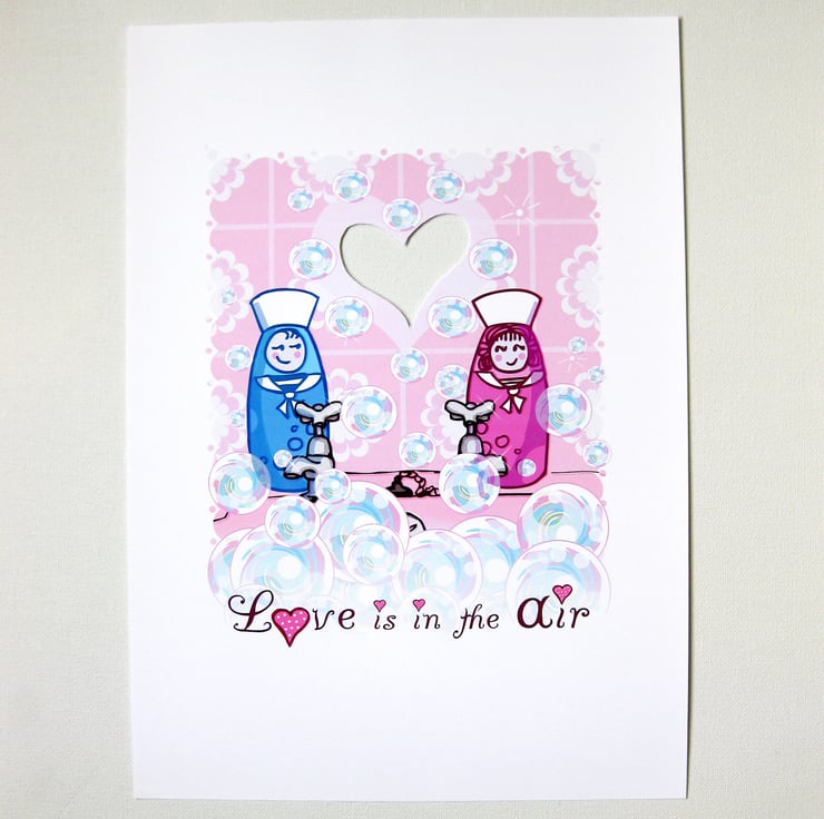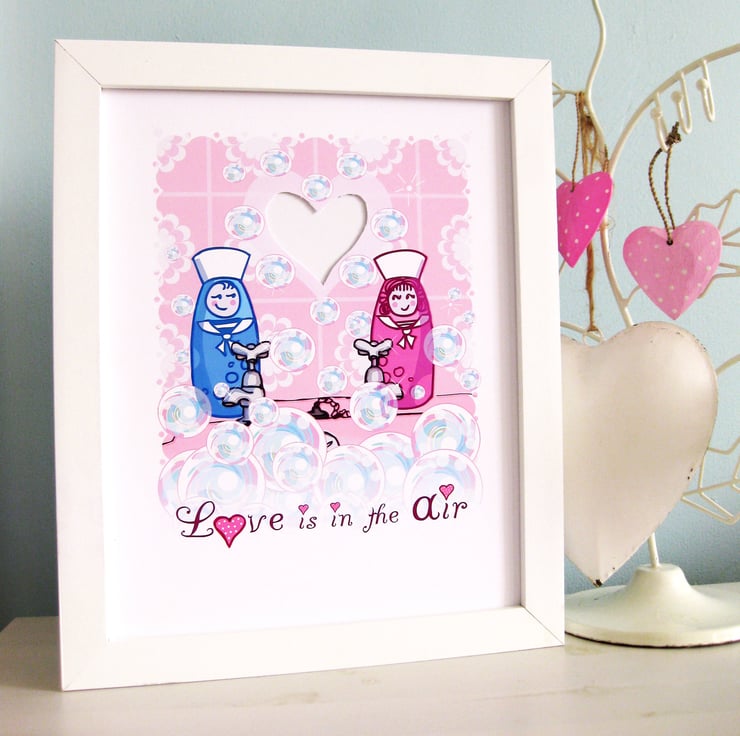 A4 print of an original illustration by yours truly. The image was created as an ink pen line drawing which has been scanned and digitally coloured. I've hand-cut a handy heart shaped photo aperture for you to put a photo of you and your loved one behind.