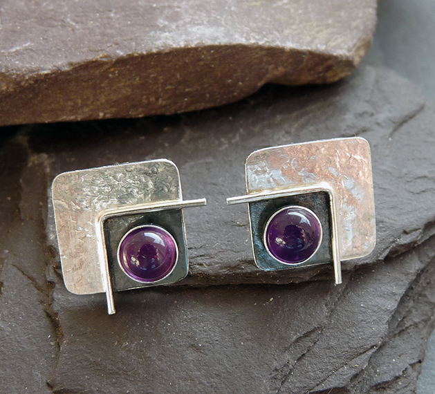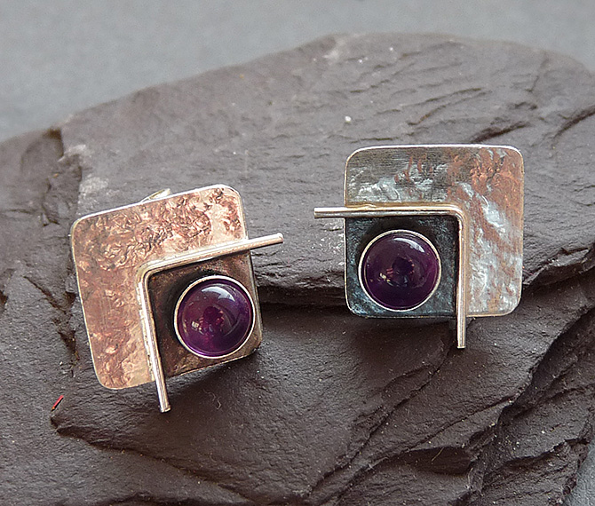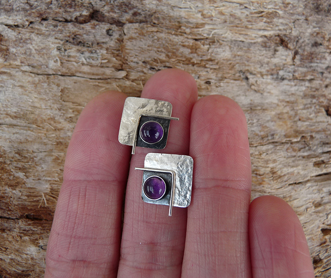 These contemporary square studs with Amethyst are completely hand made in sterling silver. They have been textured, partially oxidized and polished to a bright and shiny finish. They have sterling silver butterfly backs.