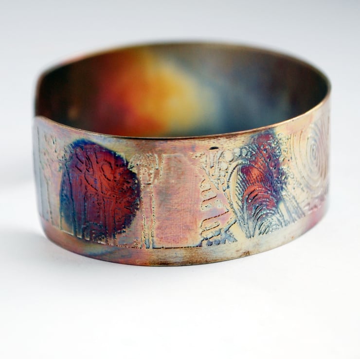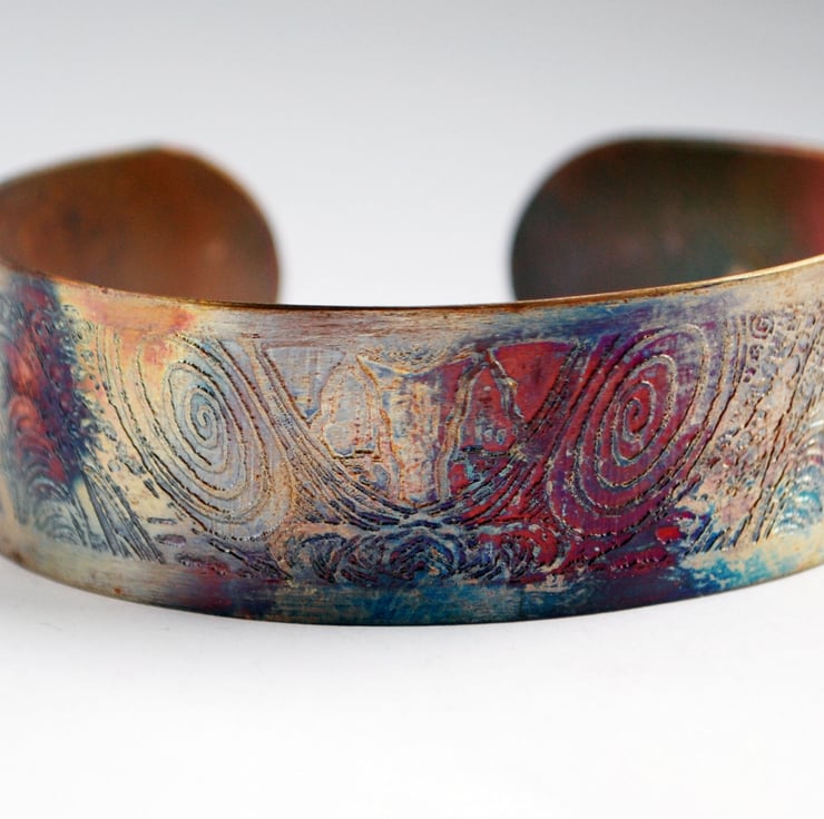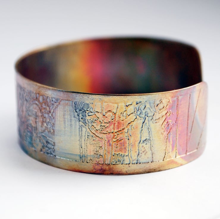 This etched copper bangle bearing cityscape imagery has been heat treated to create a vibrant multicoloured patina: this will deepen over time. I have developed a technique of literally 'painting' with a flame to manipulate the shape and direction of the colours. Although there is a degree of control, each piece is unique, as the colour patina cannot be replicated exactly.