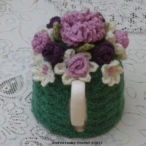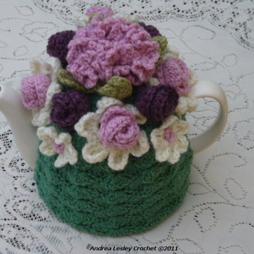 The cosy has been handmade using good quality yarn in a lovely forest green colour. The top of the cosy is decorated with a large crochet carnation in dusty pink with four sage green leaves. There are four individual small magenta coloured roses and four large cream flowers with small dusty pink rose centres. In between the large cream flowers are very pretty little flowers in cream with dusty pink centres.