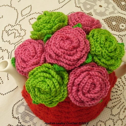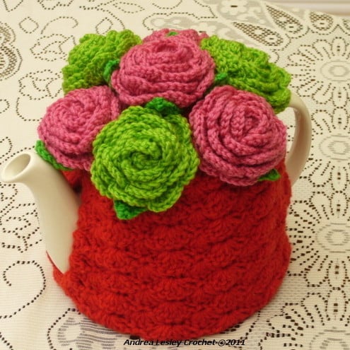 The cosy has been handmade using good quality yarn in red. The top of the cosy is decorated with seven individual roses in bright pink and green with green leaves.