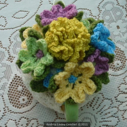 The cosy has been handmade using good quality yarn in cream. The top of the cosy is decorated with a large crochet carnation in mustard with four green leaves. Around the edges of the carnation are four individual flowers in dusty pink, blue, yellow and light green all with green leaves. In between these flowers are very pretty little flowers in contrasting colours with crochet bobble centres.