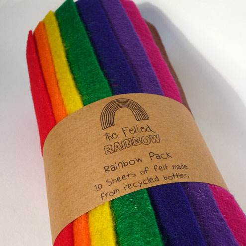 This rainbow pack is made up of 10 sheets of our recycled felt. Each sheet is 12 x 9 and each of the 10 sheets is a different colour. This pack would be great for kids or if you want to try out our felt for the first time. This felt is made in the USA from Eco-fi which is a high-quality polyester fibre made from 100% post-consumer recycled plastic bottles.