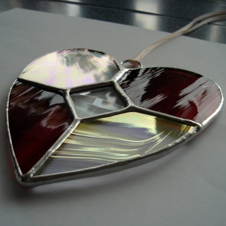 Valentine heart made from red waterglass and clear baroque. The coloured sections are made from a red and amber mix and the clear sections are irridised .The ripples in waterglass are formed by stretching the glass when it is still molten. There is a 25mm square bevel cut into the centre to create rainbow effects when the heart is hung in sunlight.