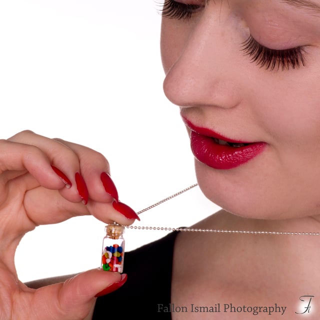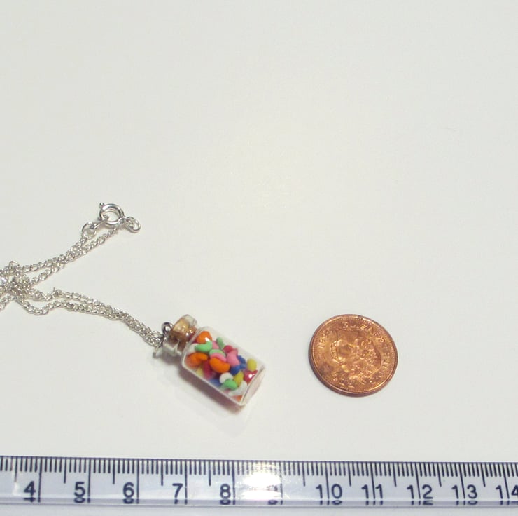 The jelly beans are made of Fimo modelling clay, while the jar is glass with a stopper in the top (this is sometimes cork, sometimes plastic)! Threaded onto a silver plated necklace chain.