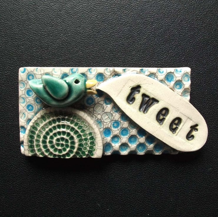 This cute little brooch is hand cut from white earthenware clay, embossed with pattern and then coloured and fired.