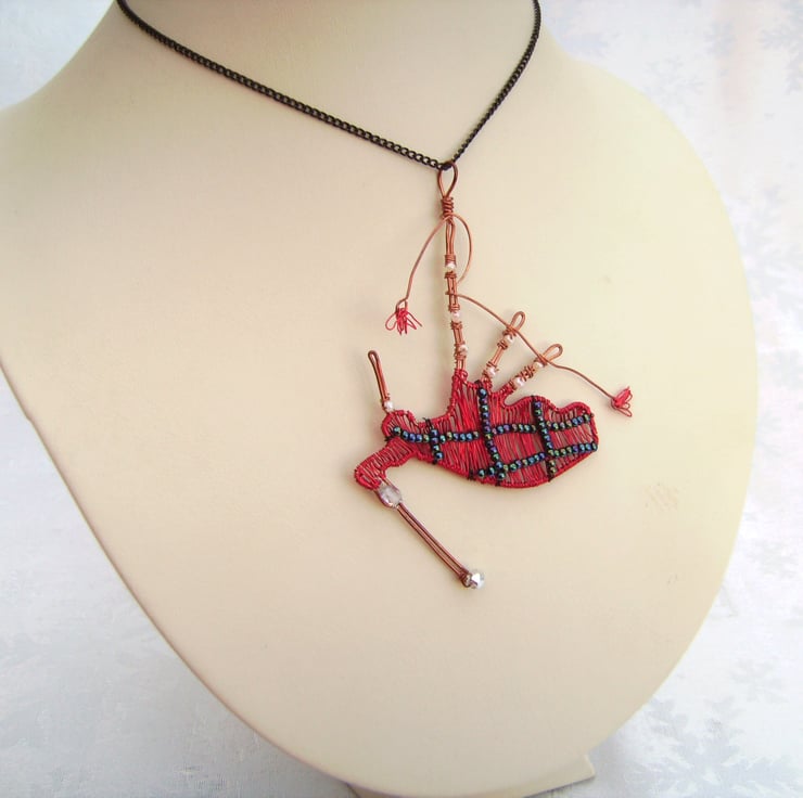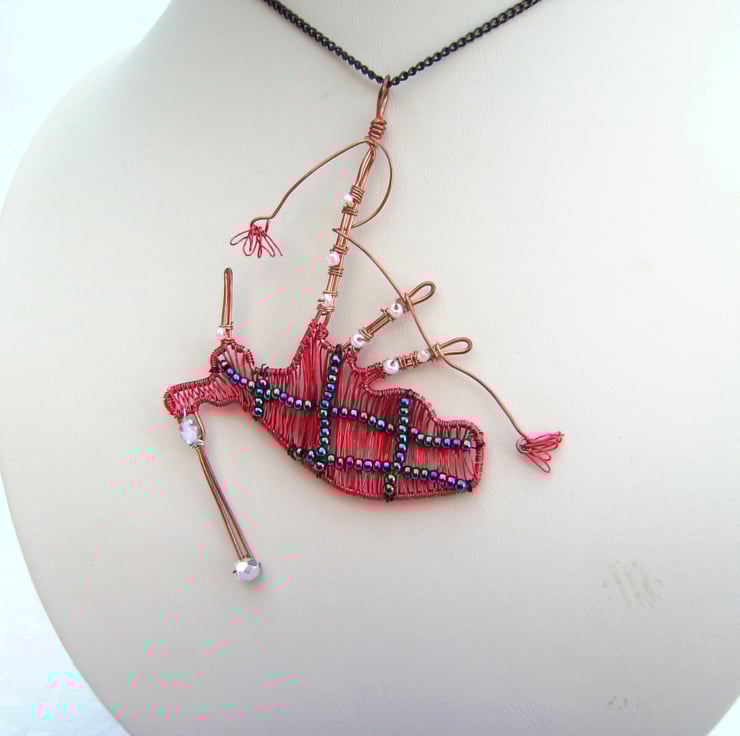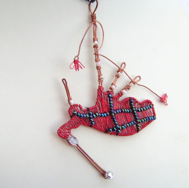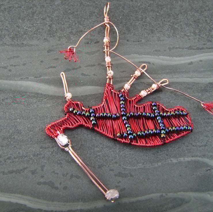This set of tartan style bagpipes, so beloved of Scotland, has been created using copper wire, crystal & seed beads shaped into place by hand.