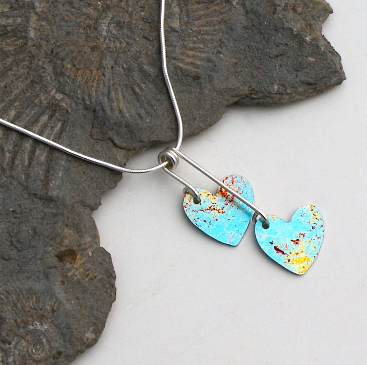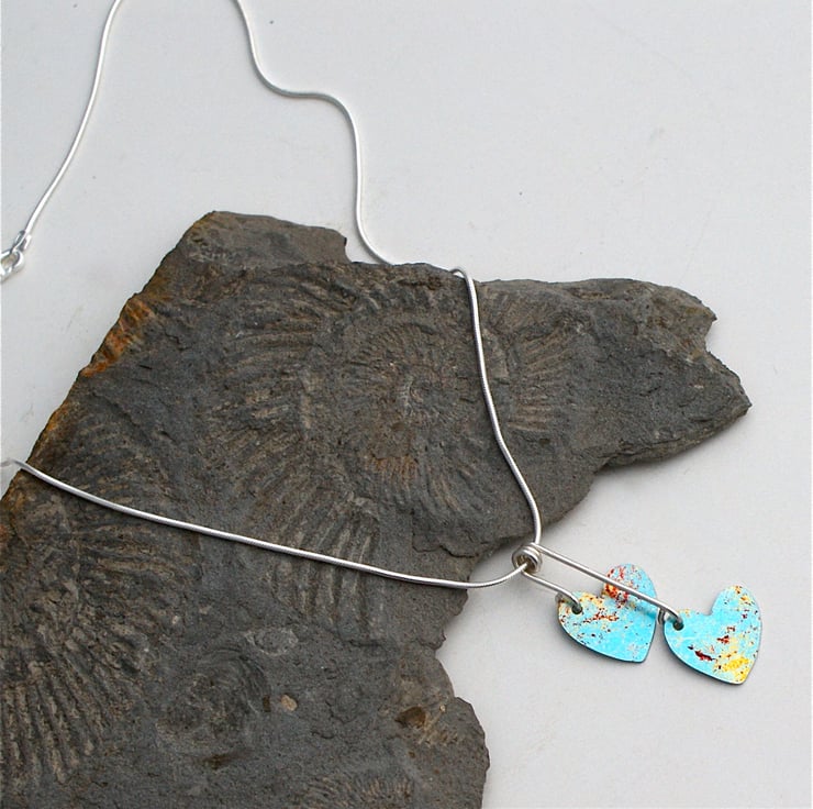 A sweet necklace with 2 hand painted aluminium hearts in turquoise, red and gold. The hearts are fixed in place with sterling silver wire and hung on a 16 sterling silver snake chain. A perfect Valentines gift!