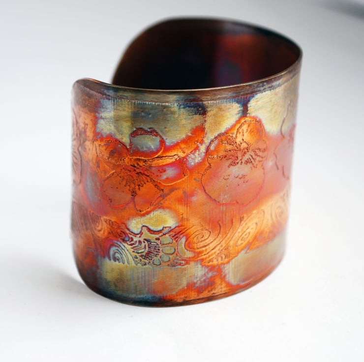This etched copper cuff bracelet / bangle bearing flowers and flowing pattern work has been heat treated to create a vibrant multicoloured patina: this will deepen over time. I have developed a technique of literally 'painting' with a flame to manipulate the shape and direction of the colours. Although there is a degree of control, each piece is unique, as the colour patina cannot be replicated exactly.