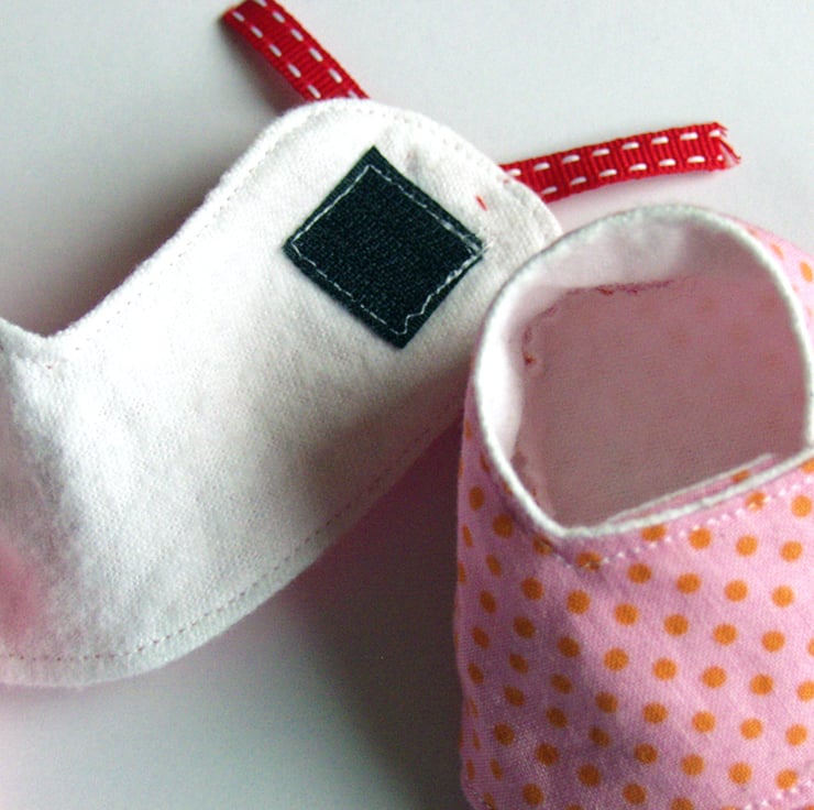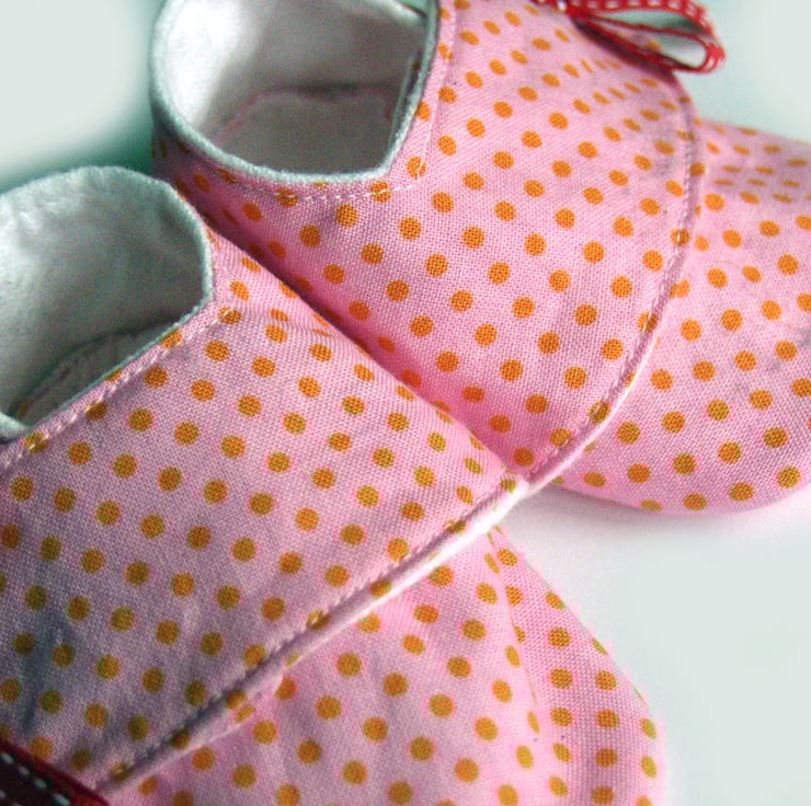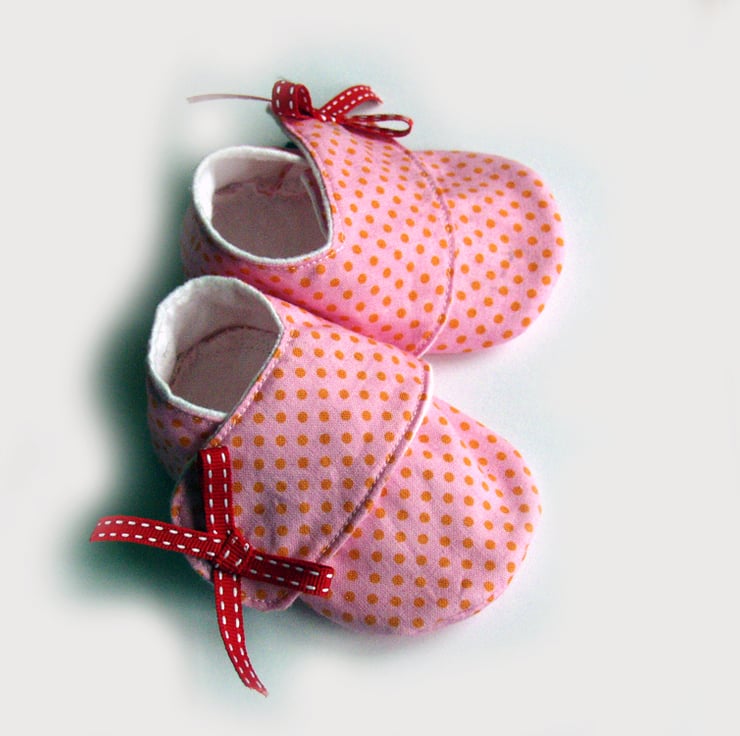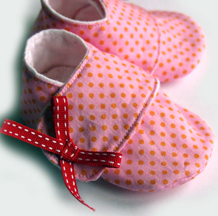 Made in baby pink fabric that is covered in tiny pinky orange dots with a sweet red bow to finish them of, these little sneakers will be perfect for a new baby girl.