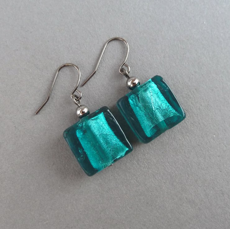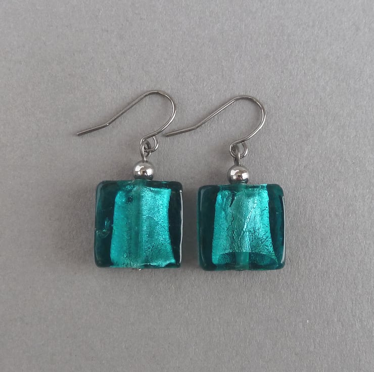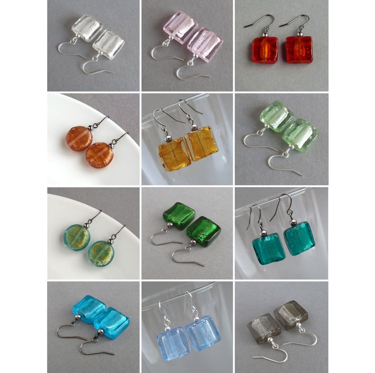 The glass beads used are 1.5cm squares. They hang from gunmetal plated ear hooks. However, for an additional £2 I can change these for sterling silver. Please email me if you would like the sterling silver hooks and I will create a custom listing at the new price of £8. All of my earrings are sold with plastic stoppers to ensure they remain securely in your ears.