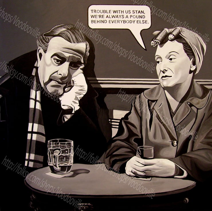 During my art degree I also did very detailed pencil drawings of people, and I wanted that almost realistic 'kitchen sink' feel for this portrait, but rendered in acrylic paint. Stan and Hilda Ogden are classic Corrie characters who will never be forgotten and I love them dearly. I hope that affection shows in this portrait.
