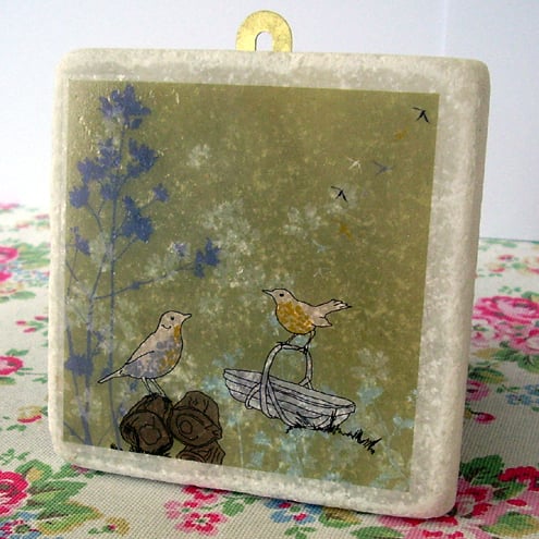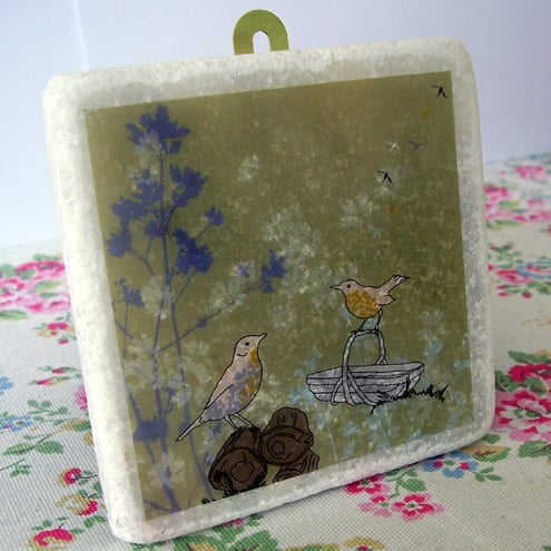 white marble tile featuring an original 'littlebirdy' design to hang on your wall!
